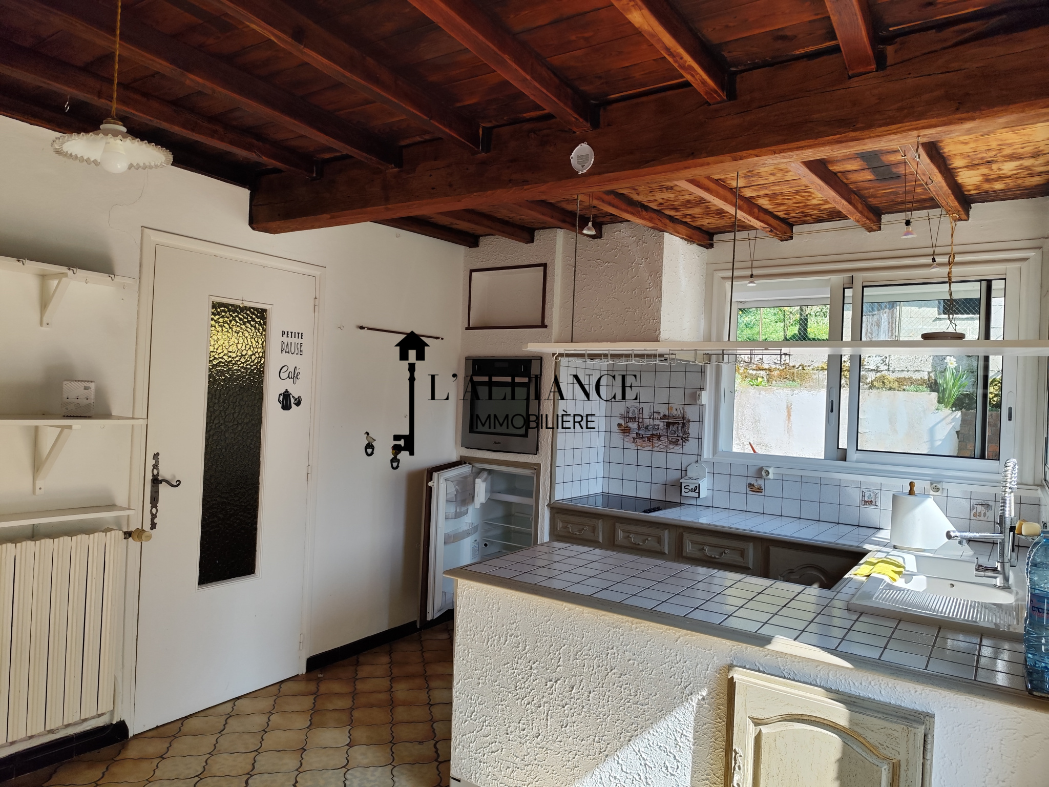 La pièce de vie spacieuse et lumineuse s’articule autour d’une magnifique cheminée ouverte d’époque, apportant chaleur et caractère à l’ensemble. La cuisine de style provençal, entièrement équipée (four, plaque de cuisson, lave-vaisselle), s’ouvre sur un jardin fleuri et une agréable terrasse, idéale pour vos repas d’été en famille ou entre amis.